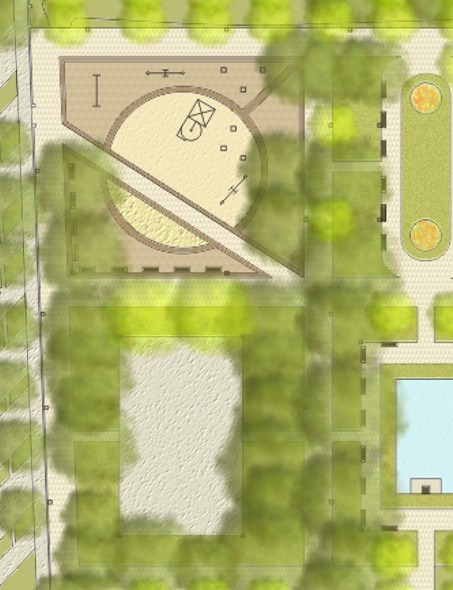 I planned a new spatial structure that based on the preservation of the old trees an the current structure of the garden. The new spatial structure is structurally four parts with three function. On the left side of the crankshaft are the recreation function (playground and sport ground) on the right side are rest functions.