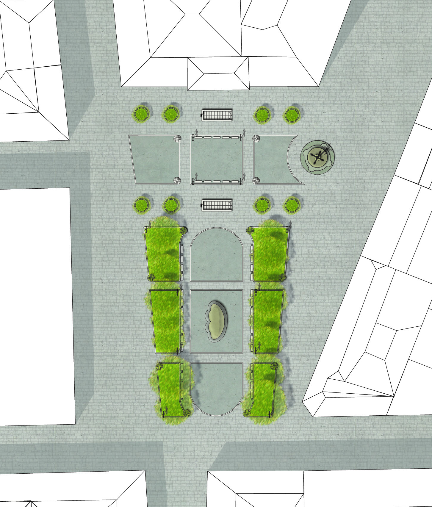 here are stylize the grassy parterrs with a small cube insertion.